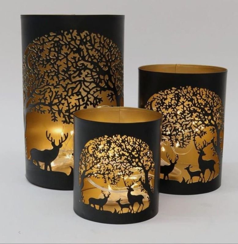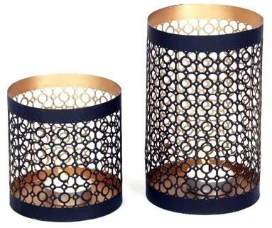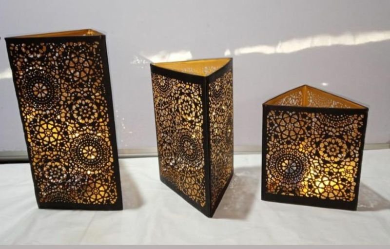 These intricately designed metal votives feature exquisite laser-cut patterns that cast mesmerizing shadows when lit, adding a warm and inviting ambiance to any space. Crafted with a rich gold interior and a sleek exterior finish, they combine elegance with durability. Perfect for tealights or small candles, these votives serve as both functional lighting and decorative art pieces, enhancing home décor, festive settings, or special occasions with their sophisticated charm.